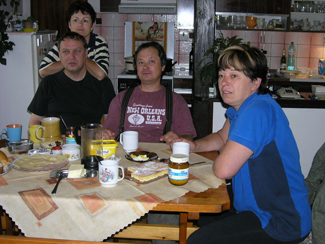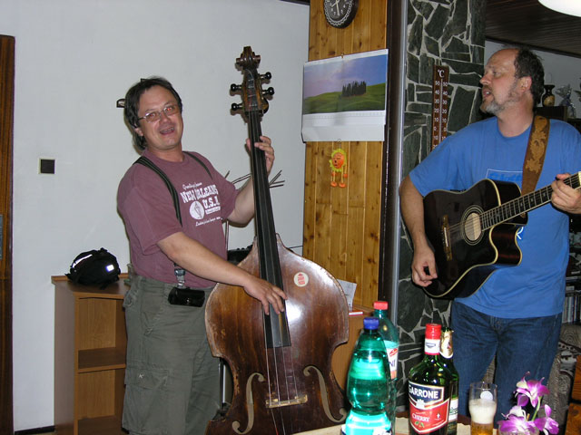 Konečně to zase jednou klaplo, mladá generace (JH) se chopila iniciativy a společné setkání v Záchlumí u Nadi a Jirky proběhlo ve velkém stylu v sobotu a neděli. Přestože se meteorologové snažili seč mohli, aby nám ten náš sejšn jaksepatří dopředu znechutili, všechno klaplo na výbornou. Počasí nebylo sice výstavní, ale do pochmurných předpovědních propršených chladných vizí mělo to prádelní dusno s občasnými slunečními prosvětleními naštěstí hodně daleko. Ale co do počasí, kamarádi se opět vydařili ! Nálada výborná, konverzace nezadrhávala, písničky taky nepřišly zkrátka a výlety do přírody ještě více znásobily následné jídelní orgie při hostitelčiných pochoutkách. Naďo, ještě jednou bychom Ti chtěli poděkovat za všechnu péči, kterou jsi nám věnovala, zvláště pak péči o naše chuťové pohárky a plná bříška. Jo, do týhle hospody se vždycky rád vracím pobejt ... A Jirko, no jistěéěéěéěéě, Tobě také velký dík za perfektní organizaci, za pohodovou atmosféru a výbornou Plzeň. Dík. Byli jste zkrátka oba skvělí, my všichni ostatní jsme byli taky skvělí, byl to zkrátka skvělý, uvolněný víkend a myslím, že si ho všichni rádi zase někdy a někde zopakujeme. Kamarádům zdar, nazdáááááár a za chvíli Ahóóóóóój !